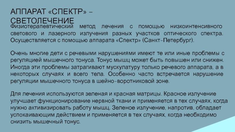 АППАРАТ «СПЕКТР» – СВЕТОЛЕЧЕНИЕФизиотерапевтический метод лечения с помощью низкоинтенсивного светового и лазерного излучения разных участков оптического спектра. Осуществляется с помощью аппарата «Спектр» (Санкт-Петербург). Очень многие дети с речевыми нарушениями имеют те