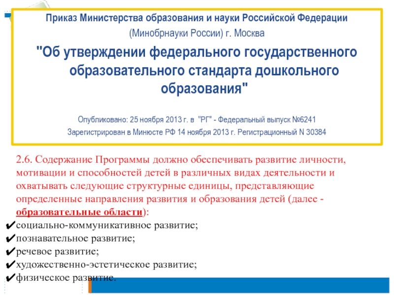 2.6. Содержание Программы должно обеспечивать развитие личности, мотивации и способностей детей в различных видах деятельности и охватывать следующие структурные единицы, представляющие определенные направления развития и образования детей (далее - образовательные области):