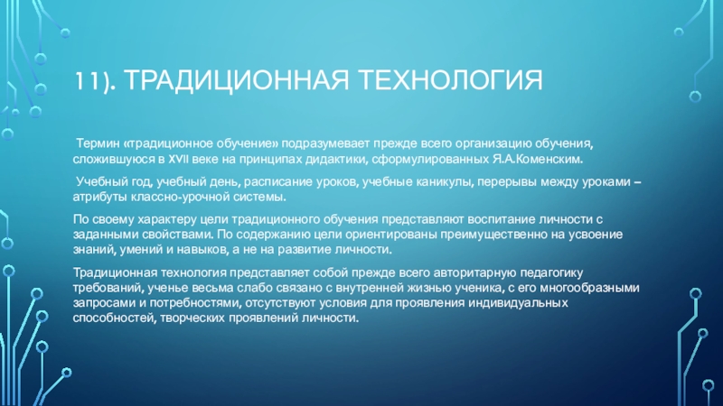 Традиционная технология представляет собой прежде всего авторитарную педагогику требований, ученье весьма слабо связано с внутренней жизнью ученика, с его многообразными запросами и потребностями, отсутствуют условия для проявления индивидуальных способностей, творческих проявлений личности.