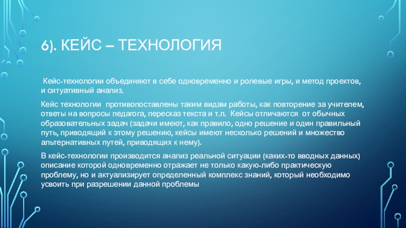 В кейс-технологии производится анализ реальной ситуации (каких-то вводных данных)описание которой одновременно отражает не только какую-либо практическую проблему, но и актуализирует определенный комплекс знаний, который необходимо усвоить при разрешении данной проблемы