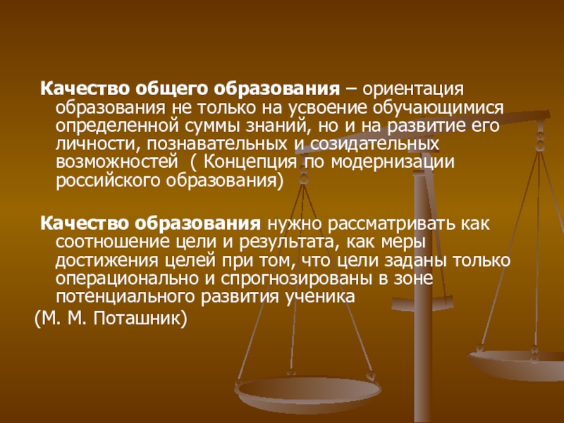 Качество образования нужно рассматривать как соотношение цели и результата, как меры достижения целей при том, что цели заданы только операционально и спрогнозированы в зоне потенциального развития ученика