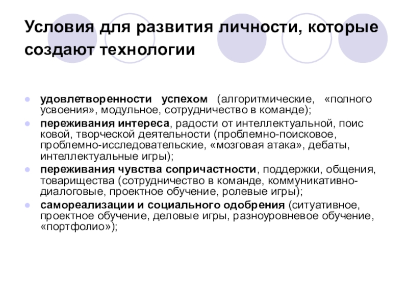 самореализации и социального одобрения (ситуативное, проектное обучение, деловые игры, разноуровневое обучение, «портфолио»);