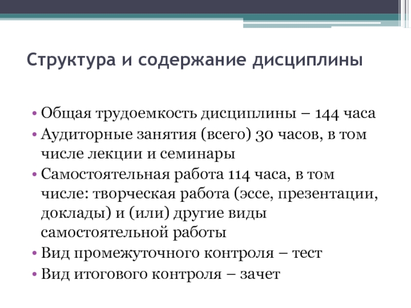 Структура и содержание дисциплины Общая трудоемкость дисциплины – 144 часаАудиторные занятия (всего) 30 часов, в том числе