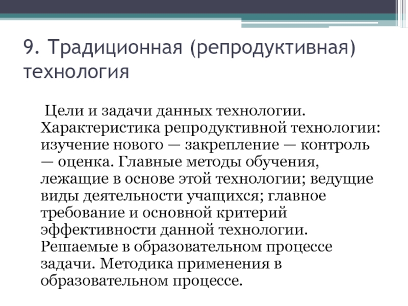 9. Традиционная (репродуктивная) технология	Цели и задачи данных технологии. Характеристика репродуктивной технологии: изучение нового — закрепление — контроль