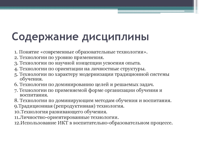 Содержание дисциплины1. Понятие «современные образовательные технологии».2. Технологии по уровню применения.3. Технологии по научной концепции усвоения опыта.4. Технологии