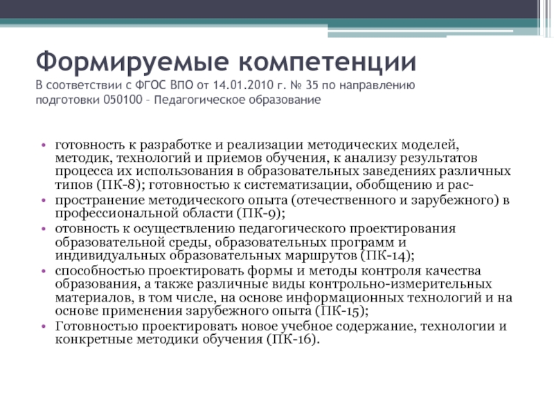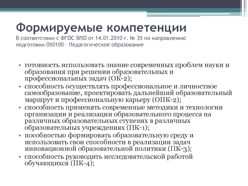 Формируемые компетенции В соответствии с ФГОC ВПО от 14.01.2010 г. № 35 по направлению подготовки 050100 –