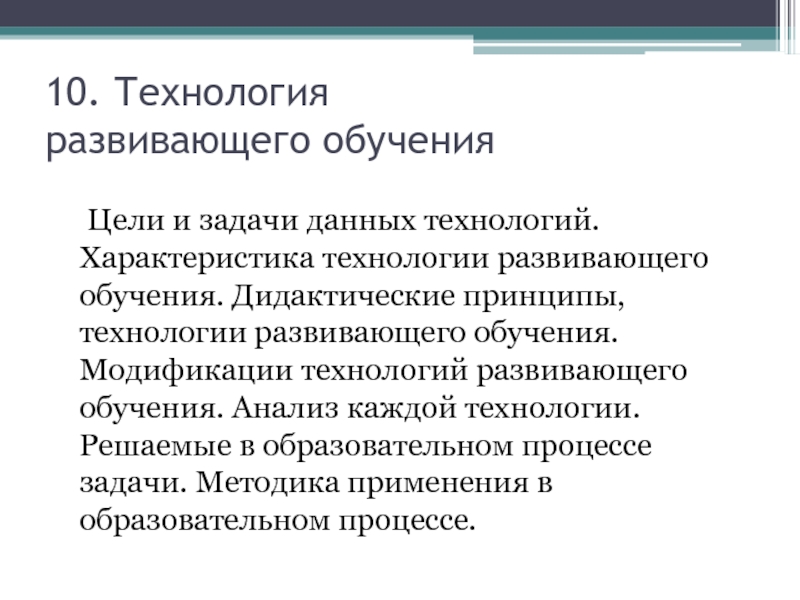 10. Технология развивающего обучения	Цели и задачи данных технологий. Характеристика технологии развивающего обучения. Дидактические принципы, технологии развивающего обучения.