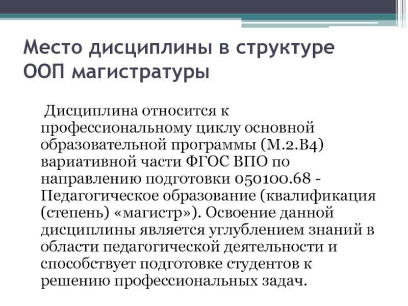 Место дисциплины в структуре ООП магистратуры Дисциплина относится к профессиональному циклу основной образовательной программы (М.2.В4) вариативной части ФГОС ВПО по направлению подготовки 050100.68 - Педагогическое образование (квалификация (степень) «магистр»). Освоение данной дисциплины