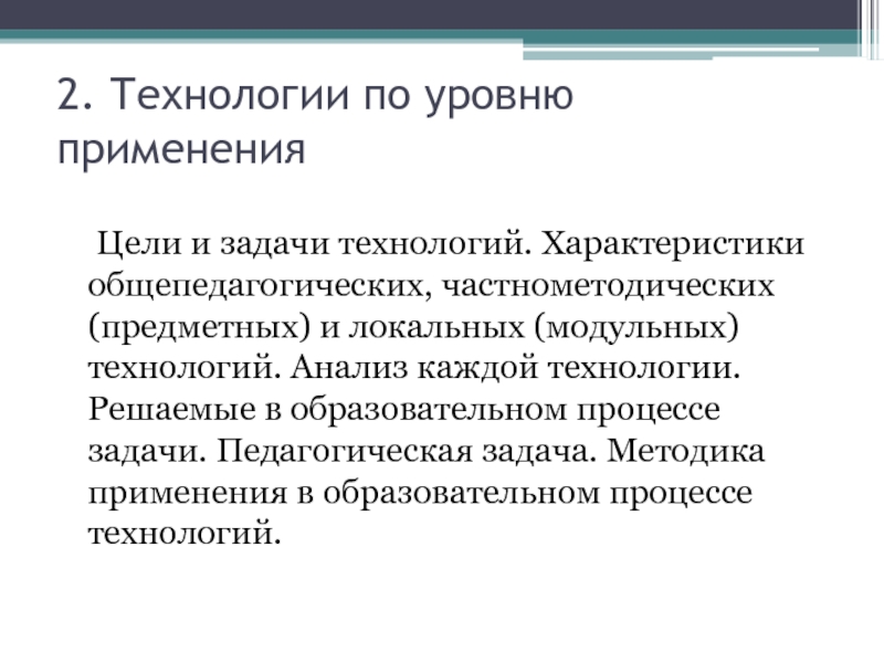2. Технологии по уровню применения	Цели и задачи технологий. Характеристики общепедагогических, частнометодических (предметных) и локальных (модульных) технологий. Анализ