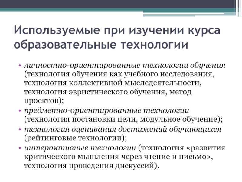 Используемые при изучении курса образовательные технологииличностно-ориентированные технологии обучения (технология обучения как учебного исследования, технология коллективной мыследеятельности, технология