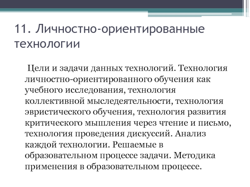 11. Личностно-ориентированные технологии	Цели и задачи данных технологий. Технология личностно-ориентированного обучения как учебного исследования, технология коллективной мыследеятельности, технология