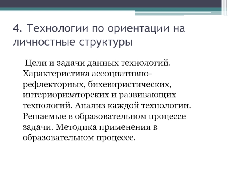 4. Технологии по ориентации на личностные структуры	Цели и задачи данных технологий. Характеристика ассоциативно-рефлекторных, бихевиристических, интериоризаторских и развивающих