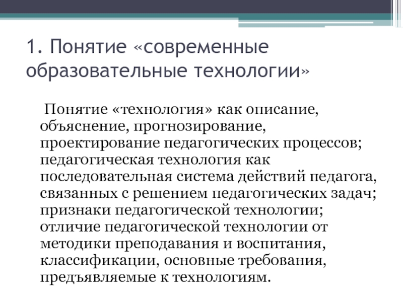 1. Понятие «современные образовательные технологии»	Понятие «технология» как описание, объяснение, прогнозирование, проектирование педагогических процессов; педагогическая технология как последовательная