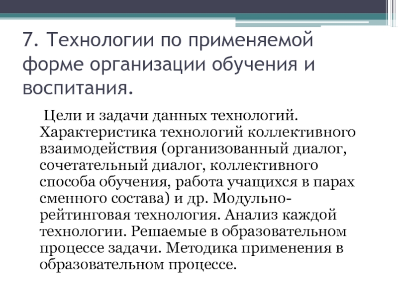 7. Технологии по применяемой форме организации обучения и воспитания.