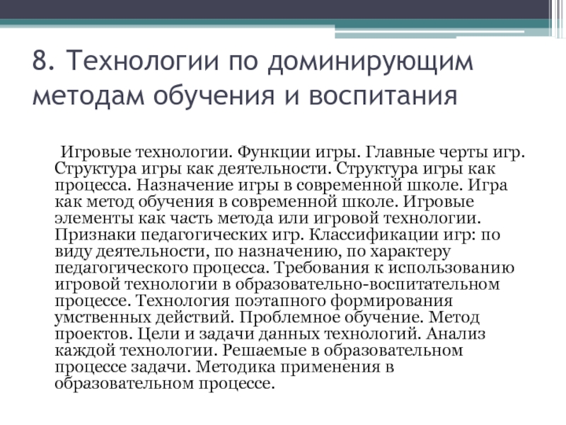 8. Технологии по доминирующим методам обучения и воспитания	Игровые технологии. Функции игры. Главные черты игр. Структура игры как