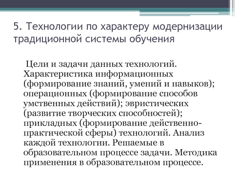 5. Технологии по характеру модернизации традиционной системы обучения	Цели и задачи данных технологий. Характеристика информационных (формирование знаний, умений