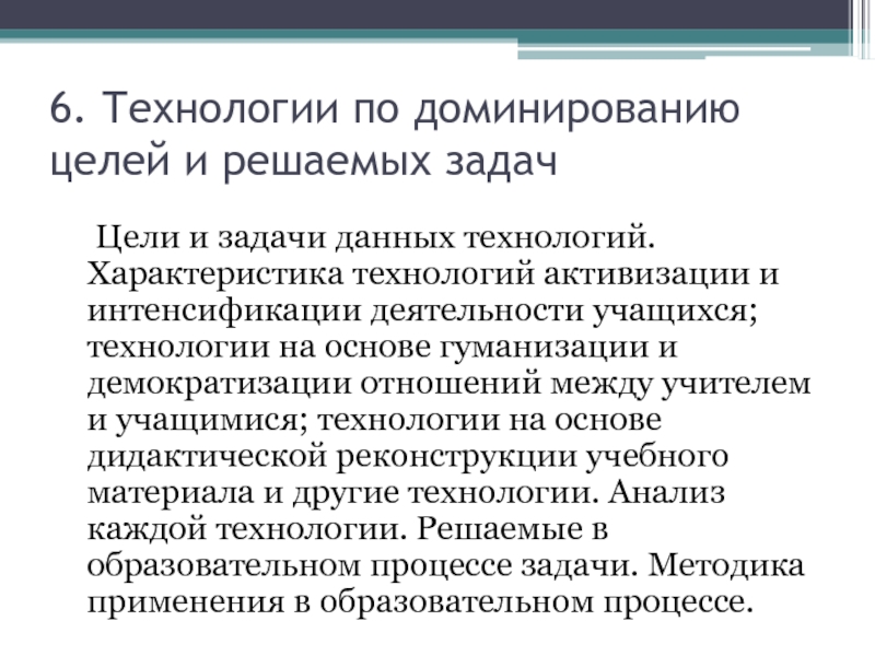 6. Технологии по доминированию целей и решаемых задач	Цели и задачи данных технологий. Характеристика технологий активизации и интенсификации