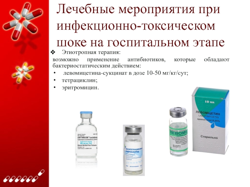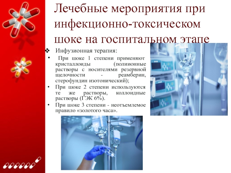 Слайд 42Лечебные мероприятия при инфекционно-токсическом шоке на госпитальном этапе