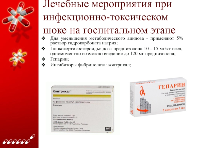 Слайд 39Лечебные мероприятия при инфекционно-токсическом шоке на госпитальном этапе