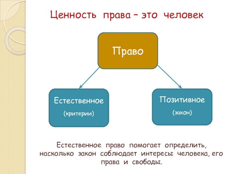Естественное право помогает определить, насколько закон соблюдает интересы человека, его права и свободы.Право Естественное(критерии) Позитивное(закон) Ценность права