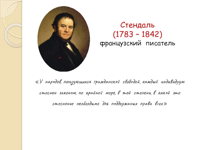 Стендаль (1783 – 1842) французский писатель«У народов, пользующихся гражданской свободой, каждый индивидуум стеснен законом, по крайней мере,