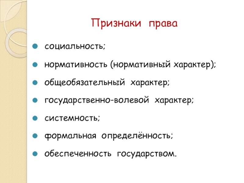 Признаки права социальность; нормативность (нормативный характер); общеобязательный характер; государственно-волевой характер; системность; формальная определённость; обеспеченность государством.