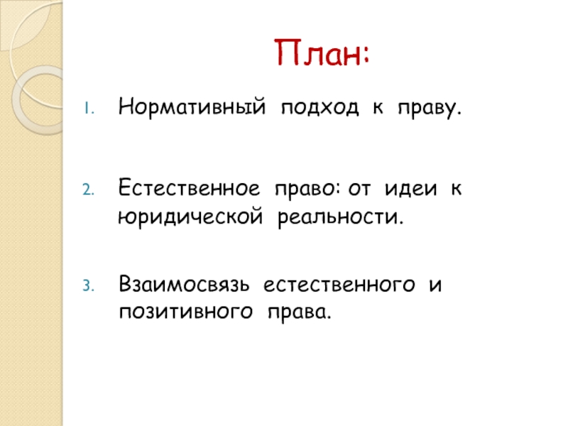План:Нормативный подход к праву.Естественное право: от идеи к юридической реальности.Взаимосвязь естественного и позитивного права.