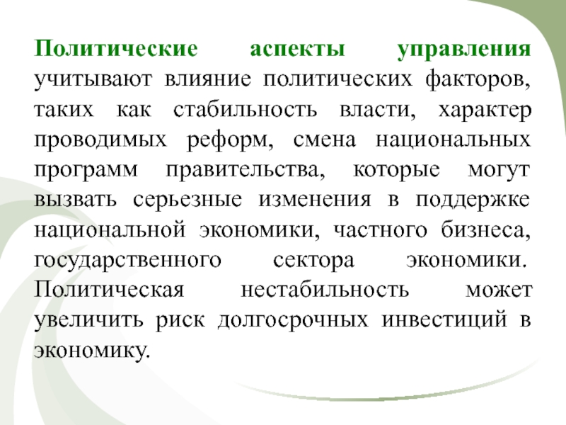 Слайд 9Политические аспекты управления учитывают влияние политических факторов, таких как стабильность