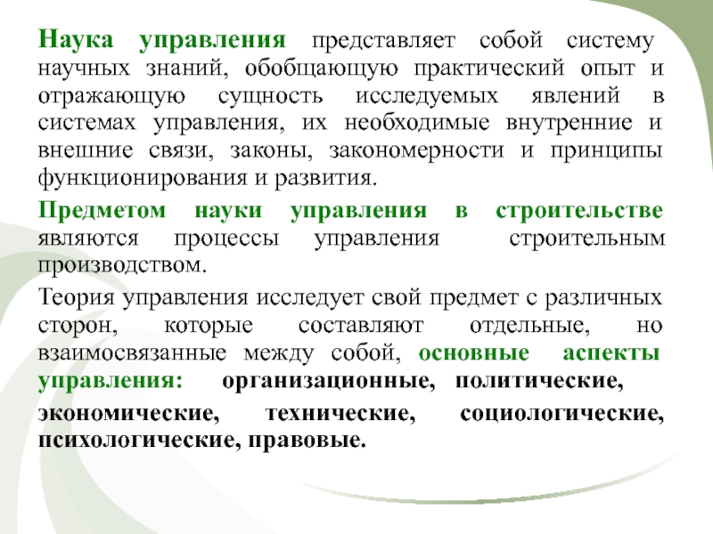 Предметом науки управления в строительстве являются процессы управления строительным производством.