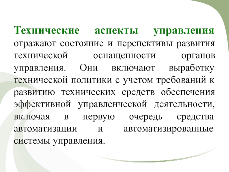 Слайд 11Технические аспекты управления отражают состояние и перспективы развития технической оснащенности
