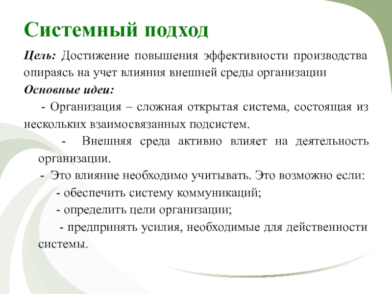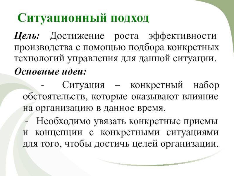 - Необходимо увязать конкретные приемы и концепции с конкретными ситуациями для того, чтобы достичь целей организации.