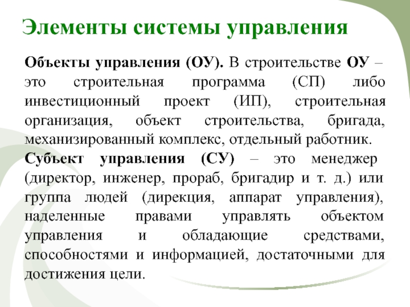 Субъект управления (СУ) – это менеджер (директор, инженер, прораб, бригадир и т. д.) или группа людей (дирекция, аппарат управления), наделенные правами управлять объектом управления и обладающие средствами, способностями и информацией, достаточными для достижения цели.
