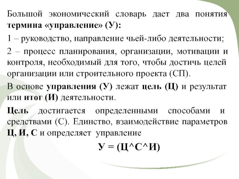 Слайд 5Большой экономический словарь дает два понятия термина «управление» (У):