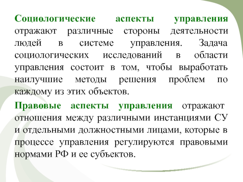 Слайд 12Социологические аспекты управления отражают различные стороны деятельности людей в системе