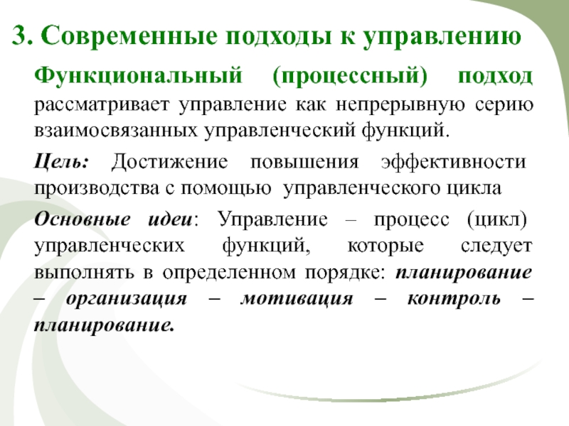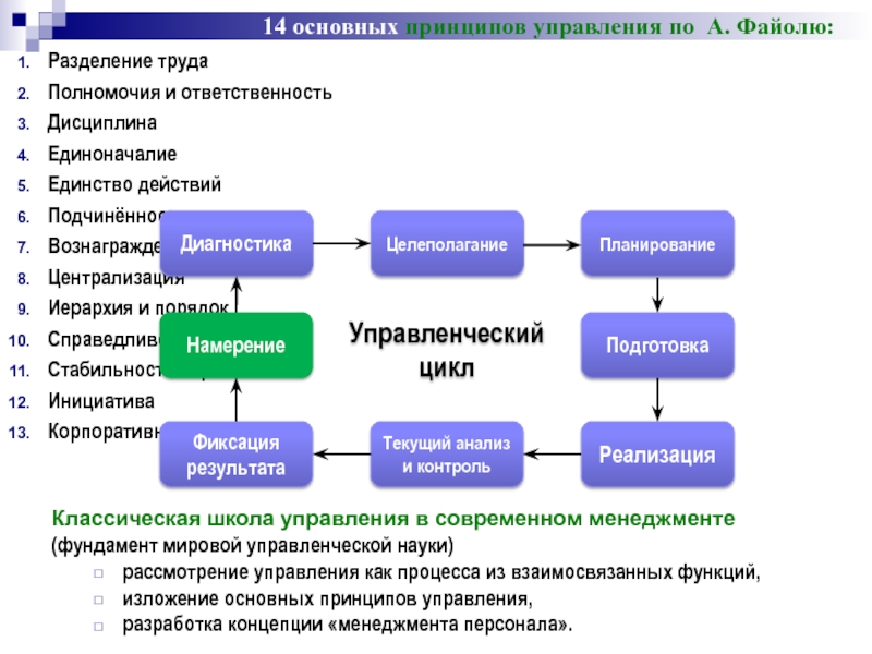 Основные идеи: Управление – процесс (цикл) управленческих функций, которые следует выполнять в определенном порядке: планирование – организация – мотивация – контроль – планирование.