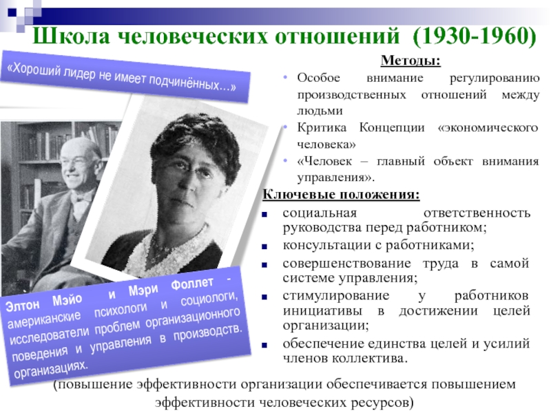 Элтон Мэйо и Мэри Фоллет - американские психологи и социологи, исследователи проблем организационного поведения и управления в производств. организациях.