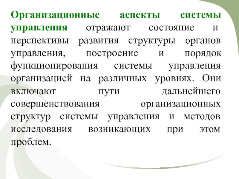 Слайд 8Организационные аспекты системы управления отражают состояние и перспективы развития структуры