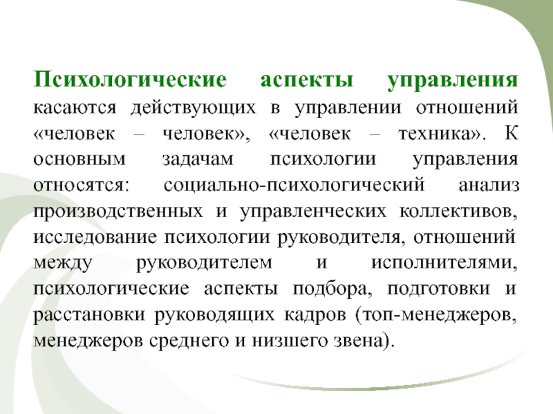 Слайд 13Психологические аспекты управления касаются действующих в управлении отношений «человек –