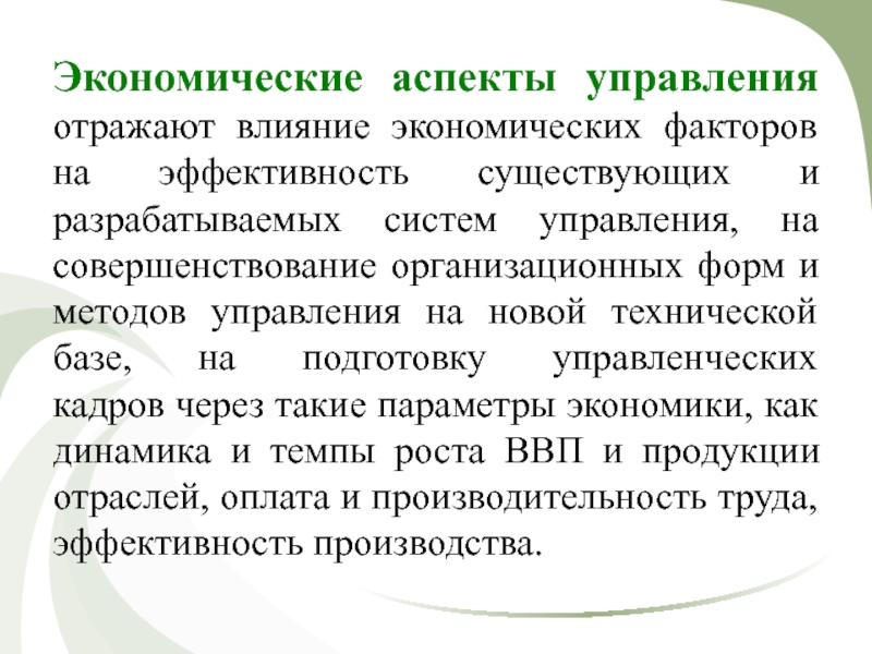 Слайд 10Экономические аспекты управления отражают влияние экономических факторов на эффективность существующих