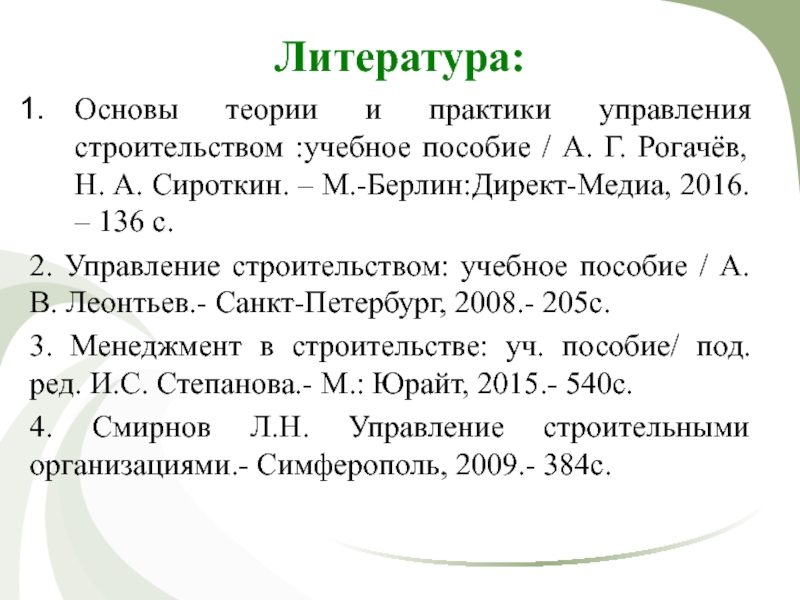 3. Менеджмент в строительстве: уч. пособие/ под. ред. И.С. Степанова.- М.: Юрайт, 2015.- 540с.