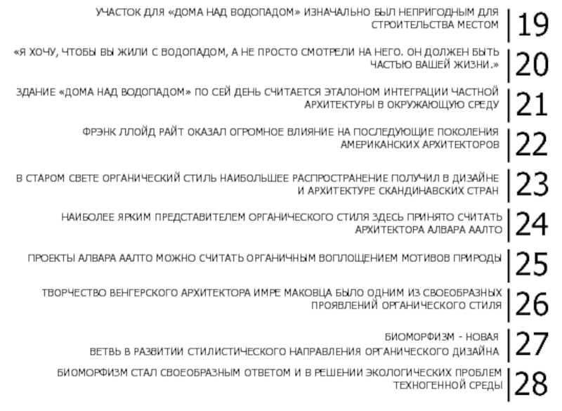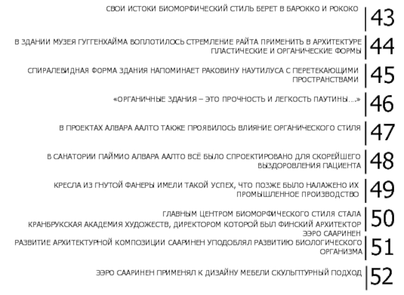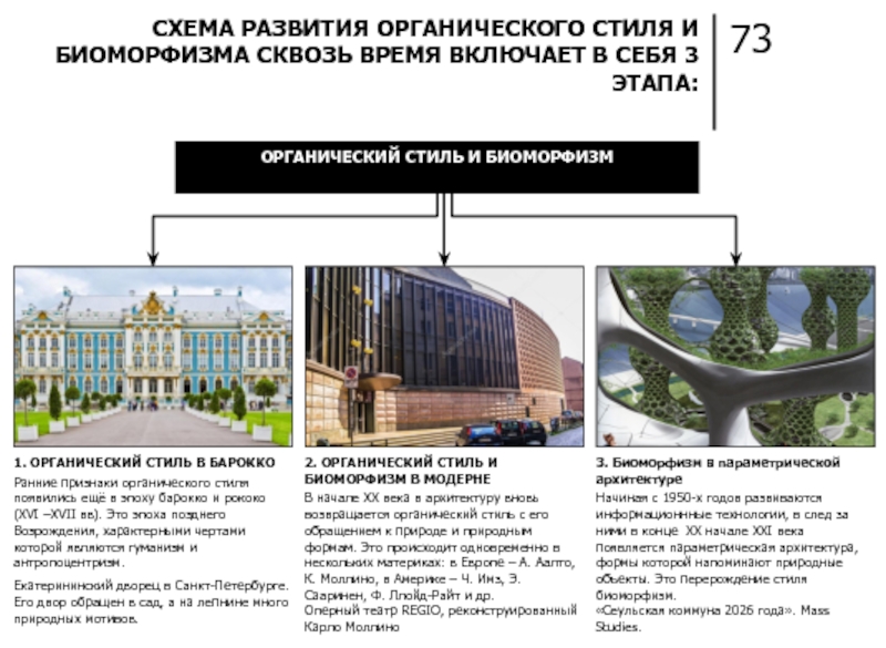 В начале XX века в архитектуру вновь возвращается органический стиль с его обращением к природе и природным формам. Это происходит одновременно в нескольких материках: в Европе – А. Аалто, К. Моллино, в Америке – Ч. Имз, Э. Сааринен, Ф. Ллойд-Райт и др.