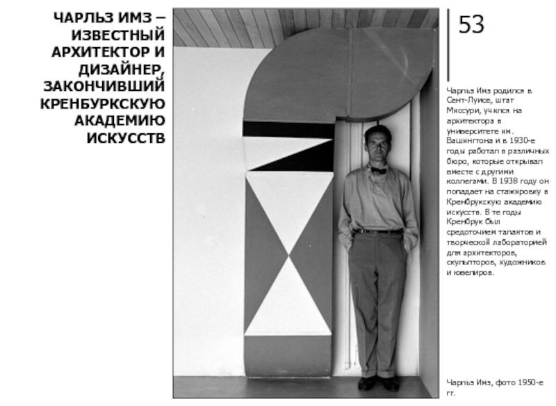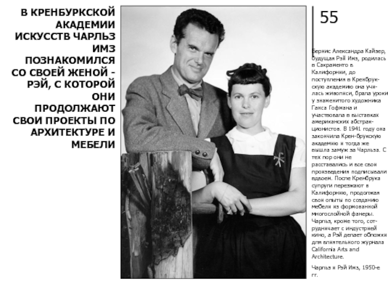 В КРЕНБУРКСКОЙ АКАДЕМИИ ИСКУССТВ ЧАРЛЬЗ ИМЗ ПОЗНАКОМИЛСЯ СО СВОЕЙ ЖЕНОЙ - РЭЙ, С КОТОРОЙ ОНИ ПРОДОЛЖАЮТ СВОИ ПРОЕКТЫ ПО АРХИТЕКТУРЕ И МЕБЕЛИ