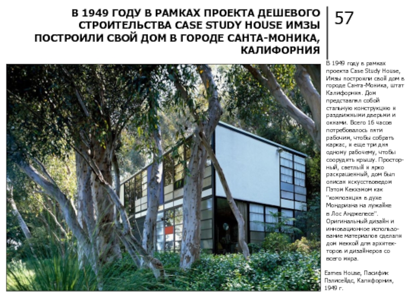 В 1949 ГОДУ В РАМКАХ ПРОЕКТА ДЕШЕВОГО СТРОИТЕЛЬСТВА CASE STUDY HOUSE ИМЗЫ ПОСТРОИЛИ СВОЙ ДОМ В ГОРОДЕ САНТА-МОНИКА, КАЛИФОРНИЯ