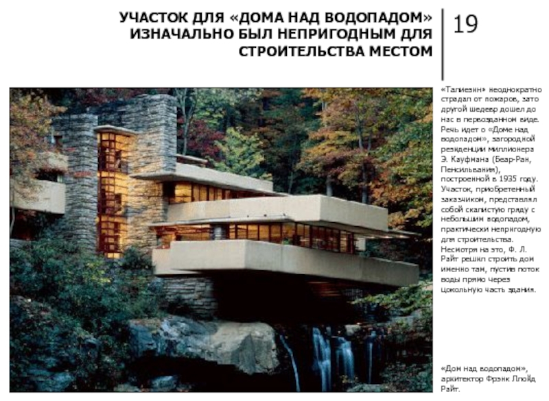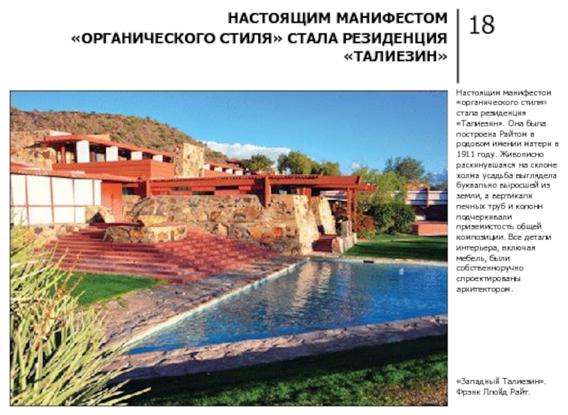 ФРЭНКА ЛЛОЙДА РАЙТА МОЖНО НАЗВАТЬ РОДОНАЧАЛЬНИКОМ ОРГАНИЧЕСКОЙ КОНЦЕПЦИИ В АРХИТЕКТУРЕ И ДИЗАЙНЕ