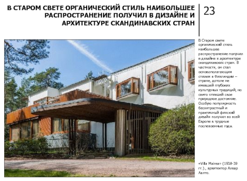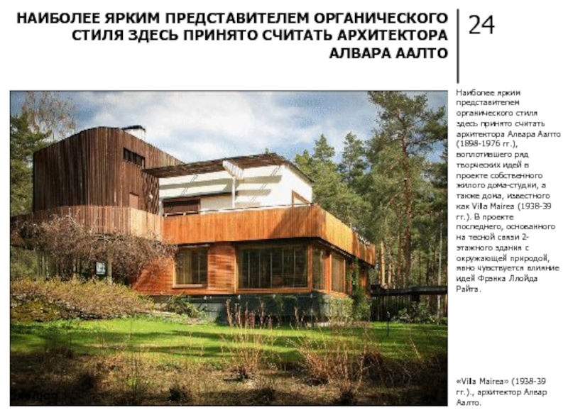 НАИБОЛЕЕ ЯРКИМ ПРЕДСТАВИТЕЛЕМ ОРГАНИЧЕСКОГО СТИЛЯ ЗДЕСЬ ПРИНЯТО СЧИТАТЬ АРХИТЕКТОРА АЛВАРА ААЛТО