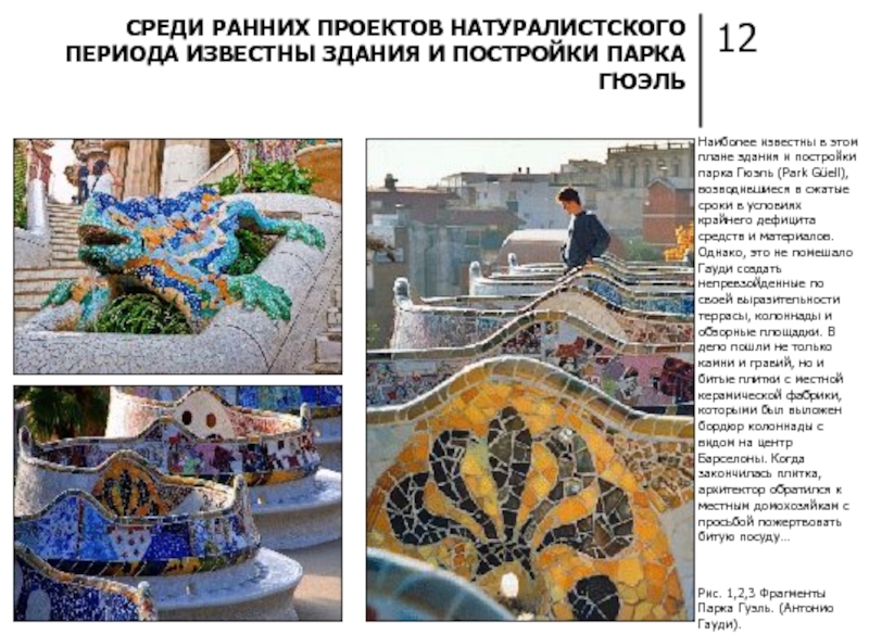 Рис. 1,2,3 Фрагменты Парка Гуэль. (Антонио Гауди).
