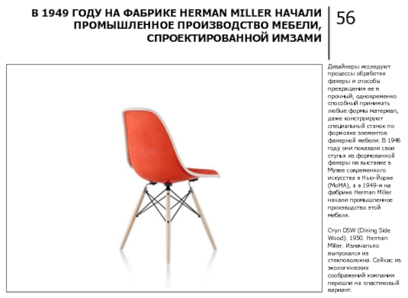 В 1949 ГОДУ НА ФАБРИКЕ HERMAN MILLER НАЧАЛИ ПРОМЫШЛЕННОЕ ПРОИЗВОДСТВО МЕБЕЛИ, СПРОЕКТИРОВАННОЙ ИМЗАМИ
