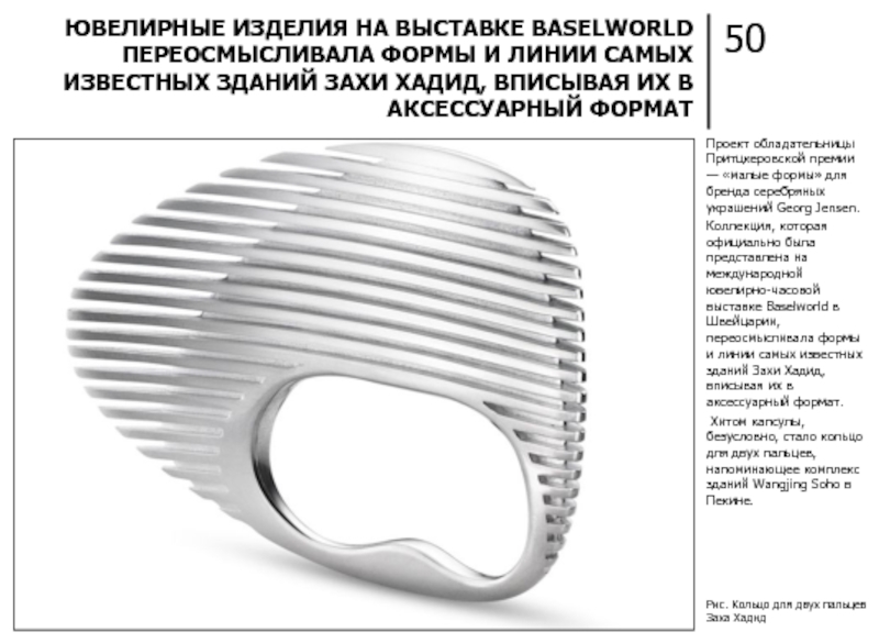 ЮВЕЛИРНЫЕ ИЗДЕЛИЯ НА ВЫСТАВКЕ BASELWORLD ПЕРЕОСМЫСЛИВАЛА ФОРМЫ И ЛИНИИ САМЫХ ИЗВЕСТНЫХ ЗДАНИЙ ЗАХИ ХАДИД, ВПИСЫВАЯ ИХ В АКСЕССУАРНЫЙ ФОРМАТ