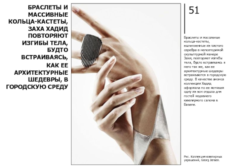 БРАСЛЕТЫ И МАССИВНЫЕ КОЛЬЦА-КАСТЕТЫ, ЗАХА ХАДИД ПОВТОРЯЮТ ИЗГИБЫ ТЕЛА, БУДТО ВСТРАИВАЯСЬ, КАК ЕЕ АРХИТЕКТУРНЫЕ ШЕДЕВРЫ, В ГОРОДСКУЮ СРЕДУ