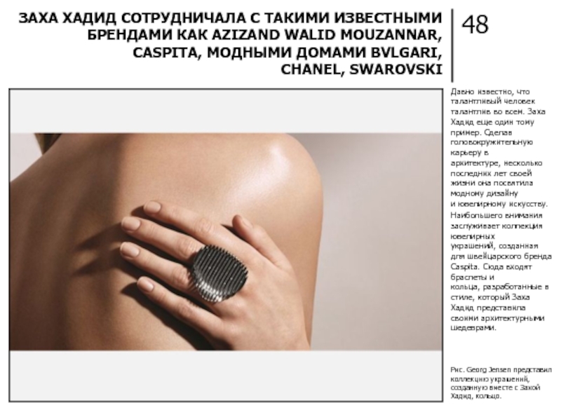 ЗАХА ХАДИД СОТРУДНИЧАЛА С ТАКИМИ ИЗВЕСТНЫМИ БРЕНДАМИ КАК AZIZAND WALID MOUZANNAR, CASPITA, МОДНЫМИ ДОМАМИ BVLGARI, CHANEL, SWAROVSKI.